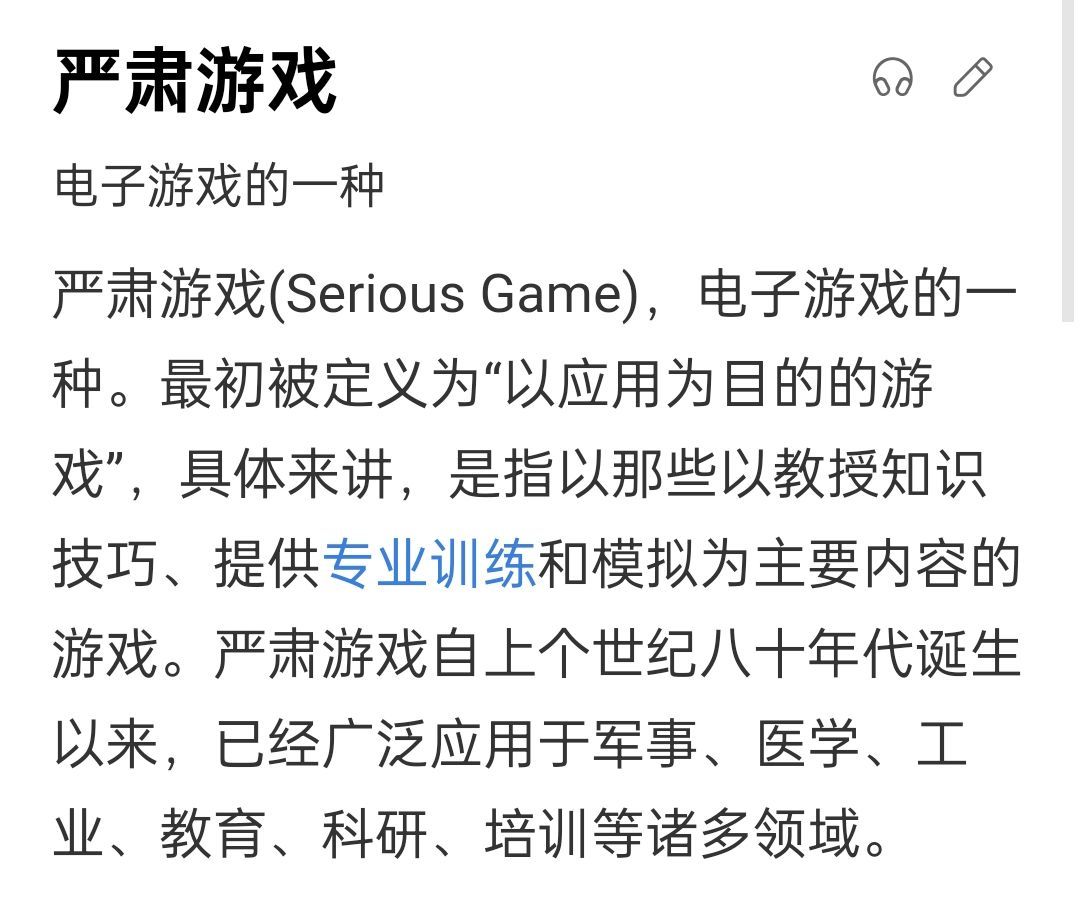 而另一部分,则是提供模拟结果。比如说股市,军事推演等等。打个比方,象棋是一种游戏,那么用穷举法推演象棋所有可能然后让你背下来就是一种严肃游戏。